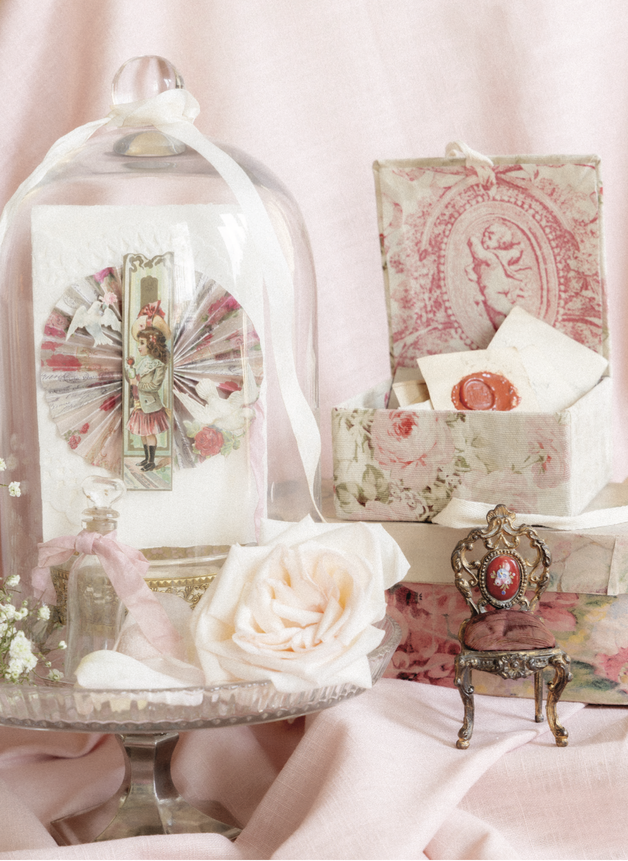 Above: A breathtaking rendition of a pocket watch chair, designed to hold the timepiece when not in use, adds diminutive charm to a display of Valentines, with one handmade card boasting three-dimensional splendor.