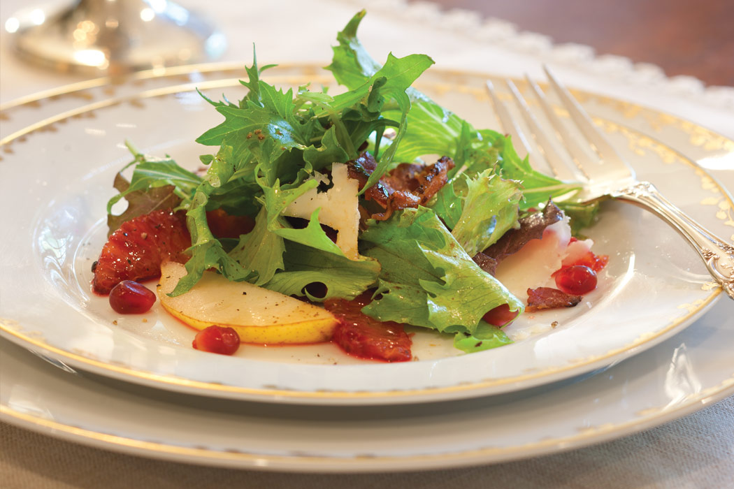 Featuring red Anjou pear, pomegranate arils, and blood orange, this tantalizing salad sings with flavor and color. The aromatic dish is dressed with delicate Pear Vinaigrette infused with pear vinegar and a heady mixture of chopped fresh herbs.