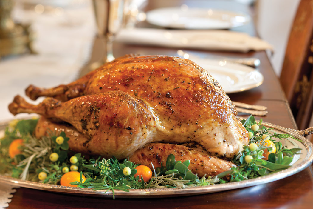 The crown jewel of the Christmas feast, our Roasted Turkey is seasoned with rosemary, thyme, sage, and citrus zests and is garnished with a brilliant mix of herbs, hypericum berries, and kumquats.