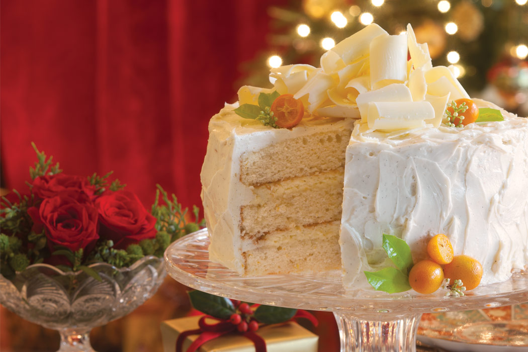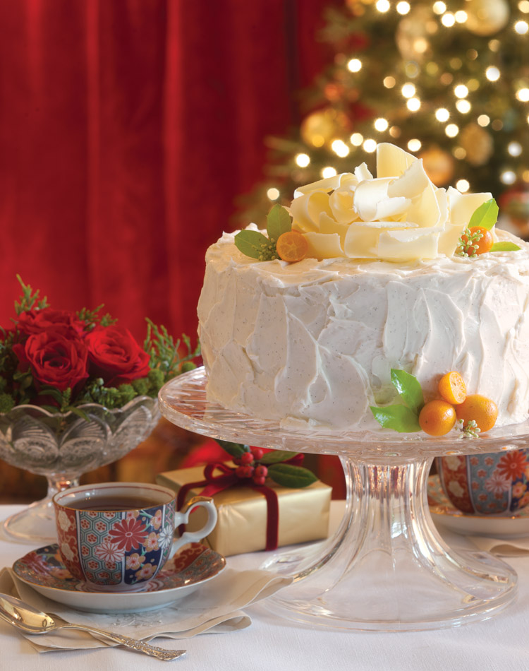 Inspire sweet dreams for a long winter’s nap with scrumptious White-Chocolate Mousse Cake scented with orange, frosted with Vanilla-Orange Buttercream icing, and garnished with decadent white-chocolate curls, kumquats, and orange blossoms. The creme de la creme for any soiree, this recipe will be requested for years to come.