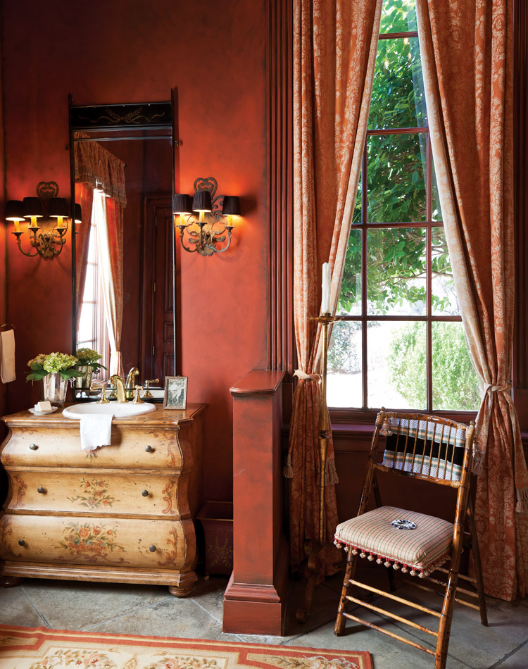 Faux-finish walls in the guest bath complement a hand-painted vanity, iron sconces, and an antique cane chair.