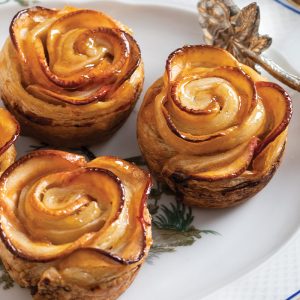 A cherished tradition of Thanksgiving is encouraging each guest to offer an expression of gratitude, and the ritual is even sweeter when the heartfelt sentiments are shared over dessert. Perfectly suited to such an interlude are Apple Roses. Gleaming ruffles of the Pink Lady variety, which retains its rosy peel and alabaster flesh during baking, bring to mind the proverbial image of lovely words as apples of gold in settings of silver.