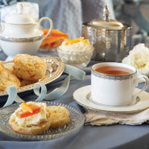 Dollops of homemade clotted cream top Candied Citrus Scones, a delectable teatime offering for the mother-to-be.