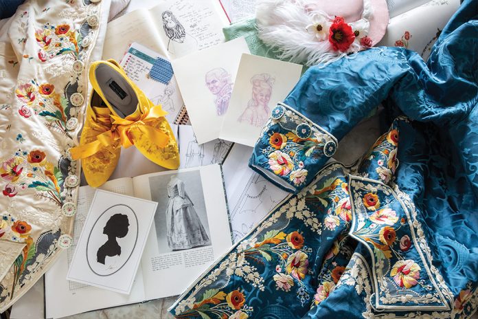 St. Louis anesthesiologist Dr. Christine Millar—known as “Sewstine” to her scores of Instagram and YouTube followers—has loved to sew since childhood, from her first forays into embroidery to the elaborate costumes she makes in the style of eighteenth-century attire. Her attention to detail is truly incredible, as evidenced by the beautiful machine-stitched embroidery, based on her own designs, that adorn her husband’s blue court suit and ivory waistcoat.