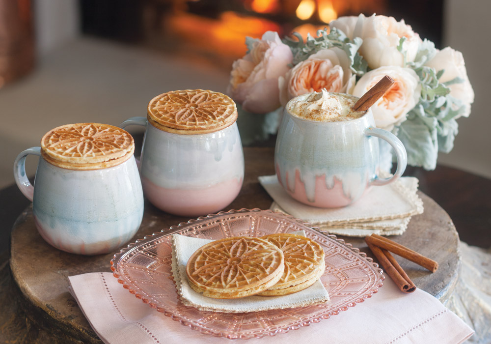 Indulge in the tastes of the local coffeehouse without ever leaving the sublime comforts of your home. A clean and creamy twist to the classic winter beverage, our Spiced White Hot Chocolate pairs perfectly with crisp, sugary Stroopwafels, delicate sandwich cookies with caramel filling.