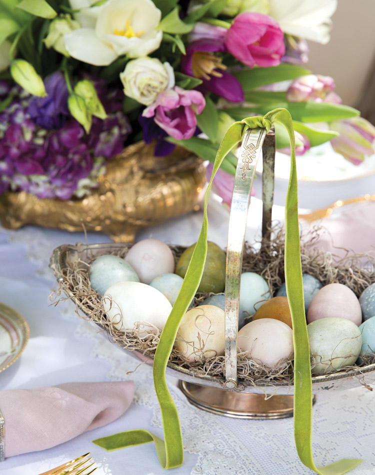 When preparing for the holiday, consider alternatives to the classic woven basket. Filled with Spanish moss and tied with velvet ribbon, a sterling silver swing basket showcases our assortment of hand-tinted eggs. Other antique pieces, such as Victorian bonbon, fruit, or flower baskets, can lend elegance to the décor.