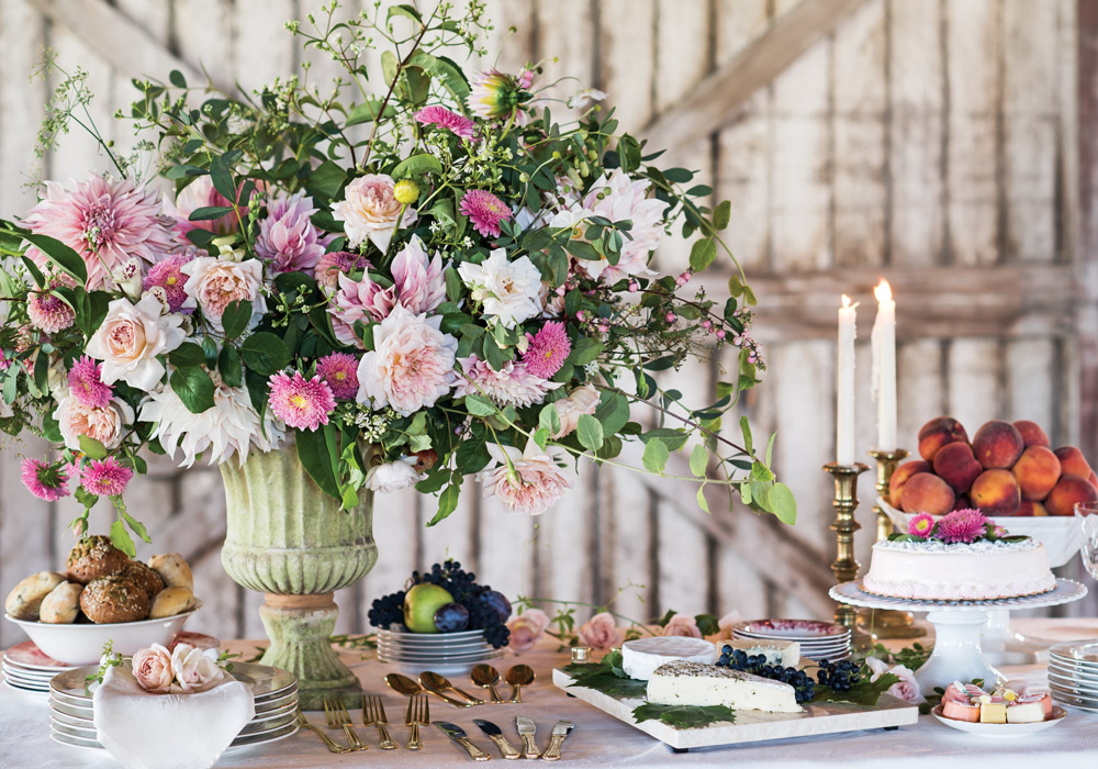 When creating a setting for a special occasion, in addition to displaying floral elements in a traditional centerpiece, consider using them in unexpected ways. “Flowers are the perfect finishing touch for any celebratory table,” says Erin. “I love to tuck delicate blossoms in napkin ties, nestle them on top of cakes, and sprinkle them around anything that needs a little extra dose of beauty.”