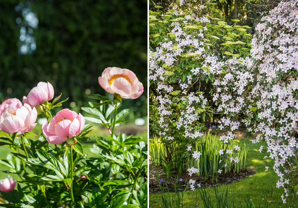 Visitors to the gardens will also see plenty of companion plants, such as alliums, pansies, and rhododendron, as well as the poppies and the clematis vines seen here. These beautifully planned spaces offer guests ideas for combinations that would work well in their own gardens.