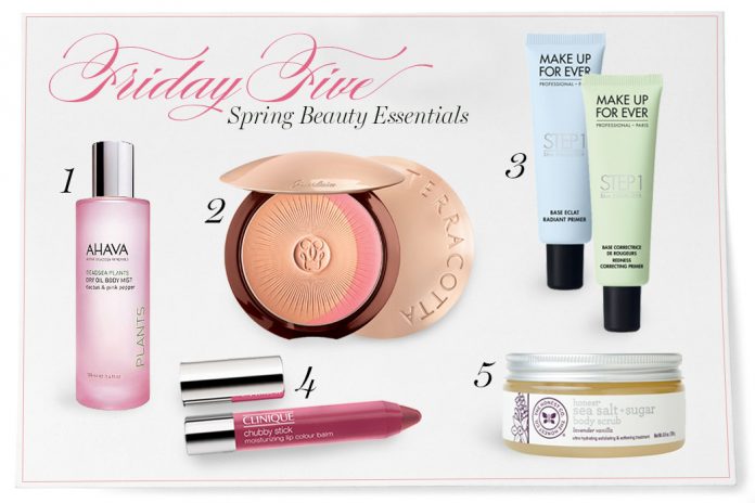 1. AHAVA Dry Oil Body Mist Cactus & Pink Pepper / 2. Guerlain Terracotta Jolie Teint / 3. Make Up For Ever STEP 1 Skin Equalizer / 4. Clinique Chubby Stick Moisturizing Lip Colour Balm / 5. The Honest Co. sea salt + sugar body scrub