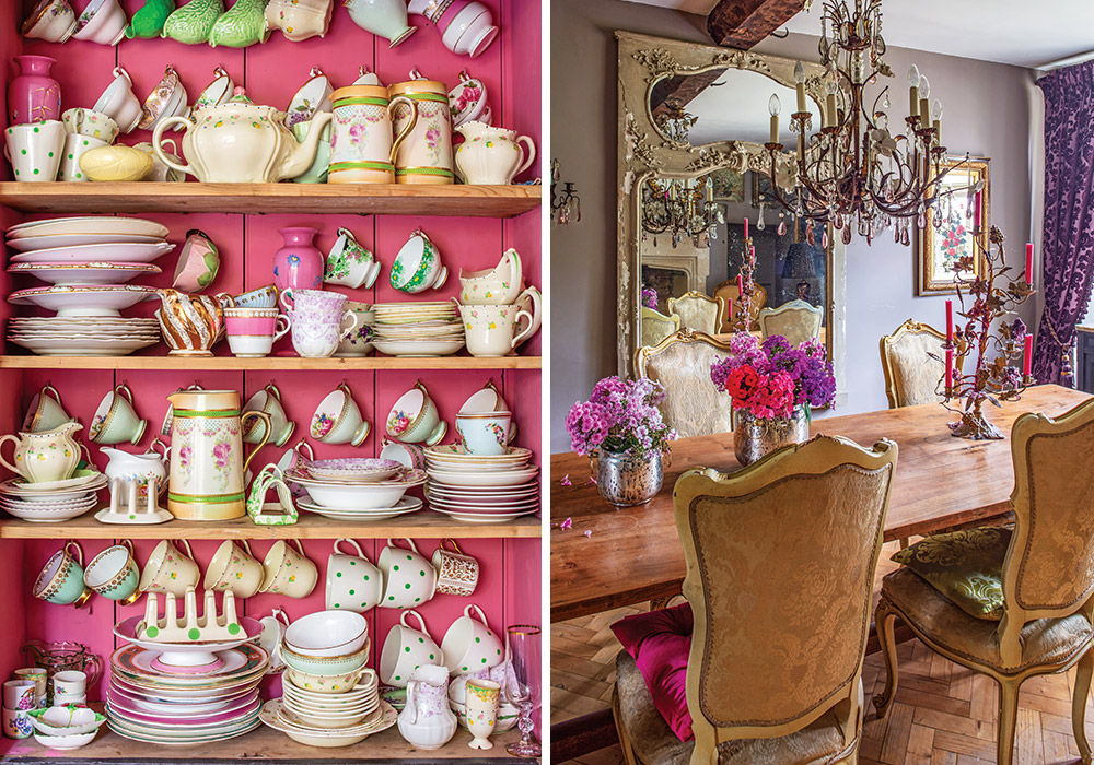 The former dairy farm held undeniable appeal. “I loved the worn stone passageway, which cuts right through the house to the garden,” says Anna, who was equally beguiled by the cozy parlor, with its worn wood beams, creaking doors, and massive fireplaces that spoke of centuries past. Her French and Italian chandeliers and toleware lights seem right at home, as do the velvet draperies and silk-upholstered boudoir bedsteads. Linked by the patina of age, the stone structure embraces its continental contents.