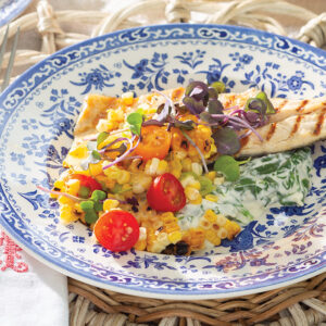 Grilled Trout with Corn-and-Tomato Salsa and Creamed Spinach tastes all the more satisfying when served in an alfresco setting. A mixture including baby spinach, garlic, and Parmesan creates a sumptuous bed for the mild white fish, which is topped with a colorful medley featuring grilled yellow corn and heirloom grape tomatoes.