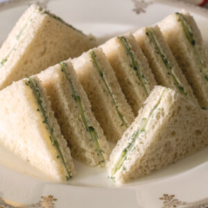 The savories course begins with Herbed Cucumber Cheese Sandwiches, a classic offering of white bread spread with a cream cheese mixture flavored with dill, chives, and parsley. Shingled cucumber slices top the seasoned filling, revealing a refreshing ribbon of green within the tasty triangles.