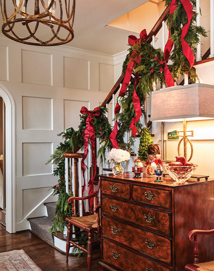 Streams of ribbon unfurl at Christmastime, winding their way through fresh-cut boughs laden with glittering ornaments, around prized collectibles arranged in enchanting vignettes, and into realms of memory connecting today’s interiors to cherished traditions of holidays past.