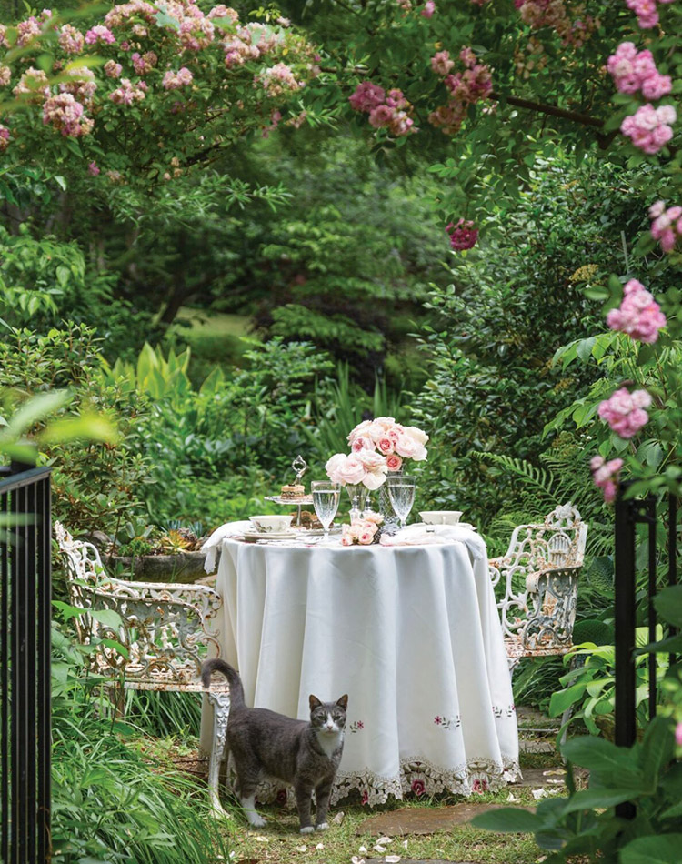 “May is a delightful time of year for a lovely backyard luncheon,” says Kathryn. If the day is gray, “bring spring indoors with fresh-cut flowers and brightly colored table settings.” A well-appointed porch or sunroom can provide idyllic surrounds with an outdoor view.