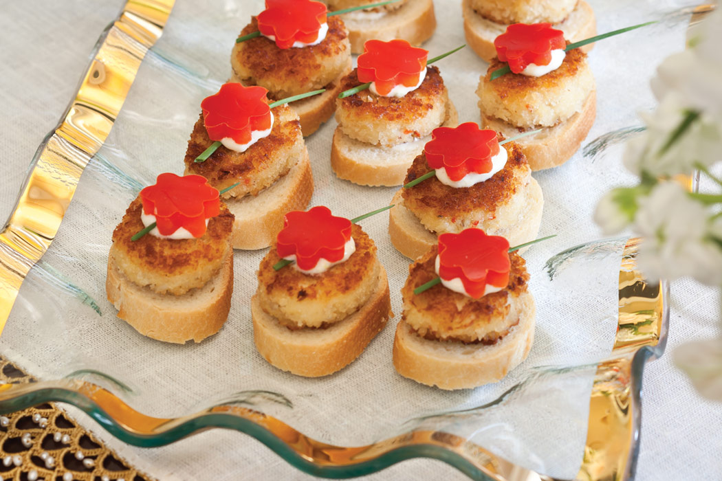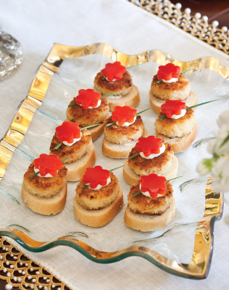 - Spoon ¼ teaspoon Lemon-Lime Aïoli onto each crostino, and top with a crab cake. Top each crab cake with another ¼ teaspoon aïoli. Garnish each with chives and a bell-pepper flower, if desired. Serve immediately.