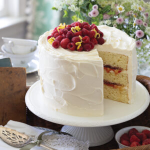 - Place one layer onto cake plate; spread a thin layer of White Chocolate Buttercream over top. Spoon 1 cup of buttercream into a piping bag. Cut a ¼-inch hole at the end and pipe a small border around the edge of the layer to create a dam. Spread ¼ cup lemon curd and then ¼ cup raspberry jam within the buttercream dam. Repeat with next layer of cake. Top with remaining layer and spread buttercream over top and sides of cake. Garnish with raspberries and lemon peel twists, if desired.