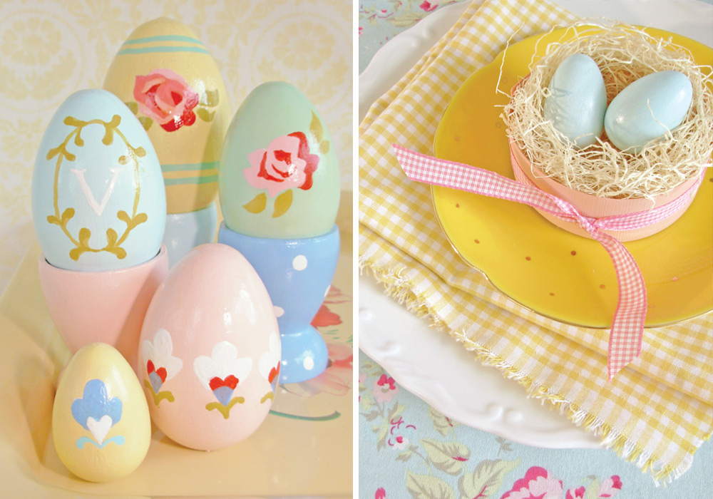 Paint eggs and eggcups with several coats of a base color, and let dry completely. Using a pencil, lightly draw designs on the egg. (You can take inspiration from folk art patterns or floral motifs.) Paint details, and let dry.