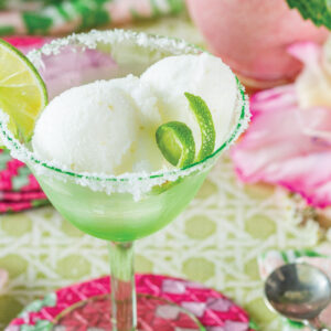 3. Before serving, let soften for 5 to 10 minutes. Prepare the rim of margarita glasses with remaining ¼ cup lime juice and kosher salt, if desired. Serve sorbet in margarita glasses. Garnish with lime slices and lime curls, if desired. Store in an airtight container in the freezer for up to 1 month.