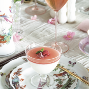 8. Gently spoon raspberry mixture over set milk pudding mixture. Top with halved raspberries and cherry blossoms. Return to refrigerator until fully set, about 1 hour. Garnish with mint leaves, if desired.
