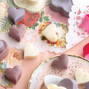 Moulded White Chocolate Hearts with Orange and Elderflower White Chocolate Ganache