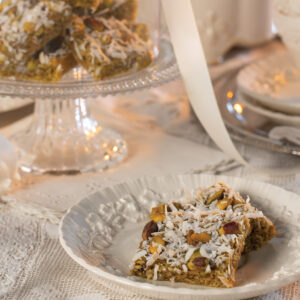 - Transfer mixture to prepared pan, spreading evenly. Top with remaining ÂĽ cup pistachios and remaining ÂĽ cup coconut flakes and gently press into top to adhere.