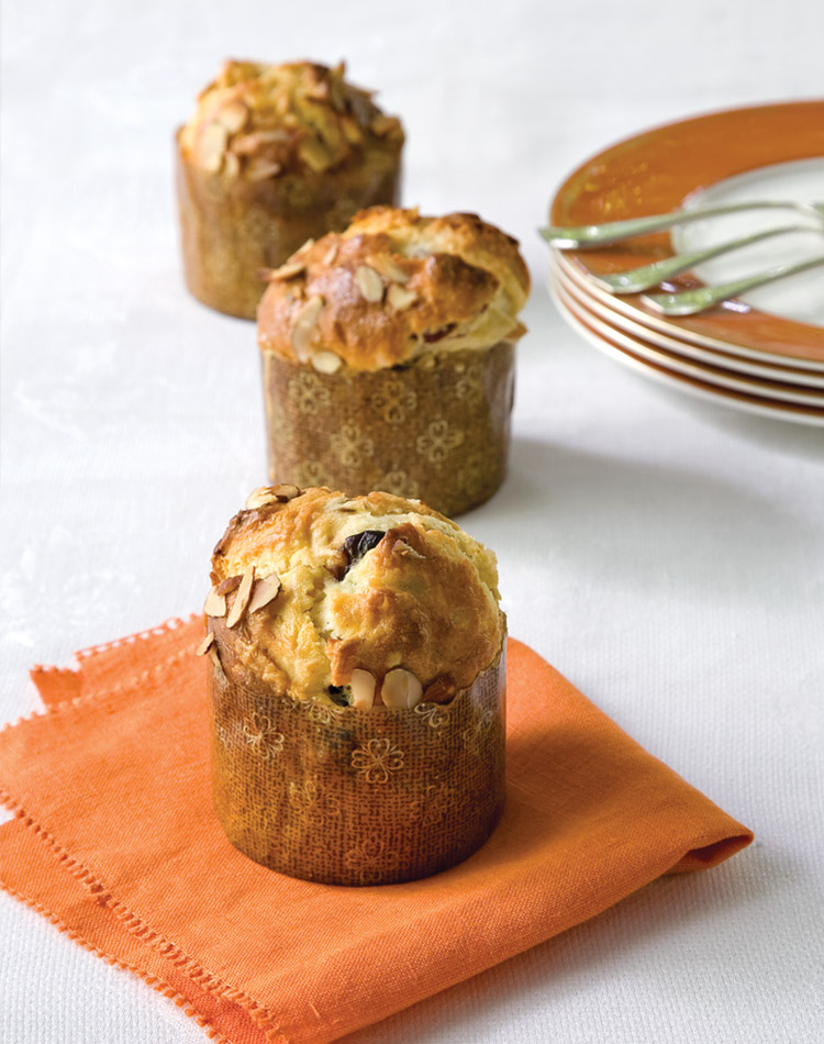 7. Sprinkle tops of loaves with sliced almonds. Bake for 10 minutes, then reduce heat to 350°; bake until tops are golden brown and rise slightly above rims of paper moulds, about 15 minutes. Cover with tented aluminum foil to prevent tops from getting too brown, if necessary.