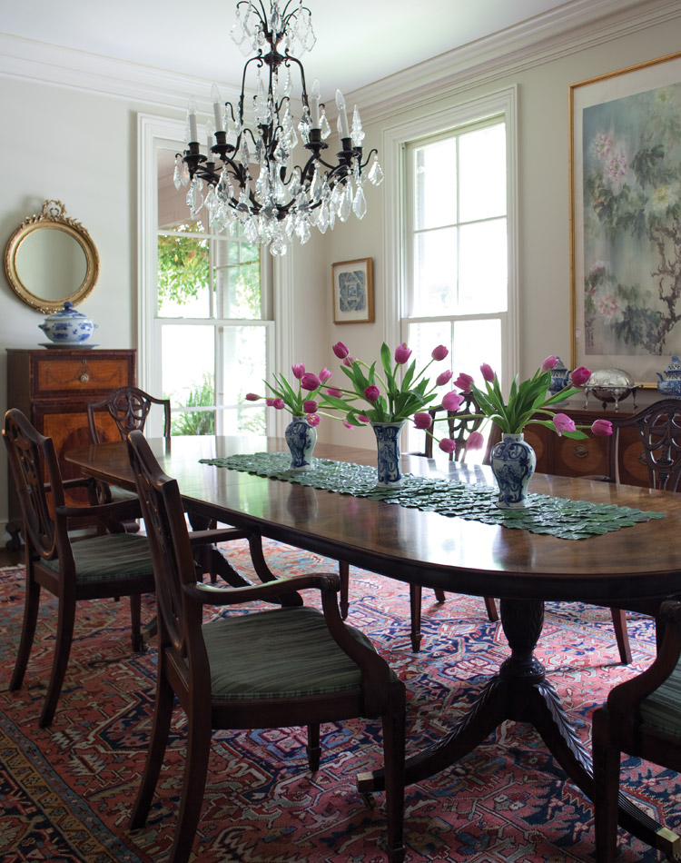 The dining-room table—a roomy English reproduction paired with Chippendale-style chairs— showcases some of Amy’s favorite blue-and-white vases brimming with sprays of fresh pink tulips. The lavish Heriz rug beneath reiterates her preferred palette of pink and blue.