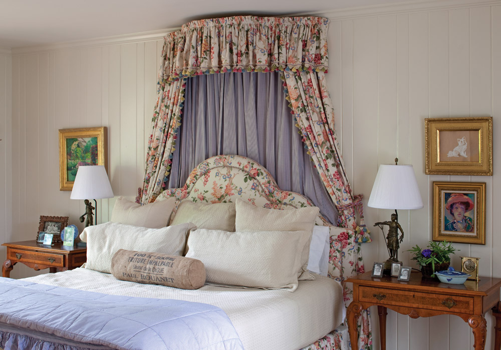 Interior designer Kimberly Bean created the romantic ruffled cornice, draperies, and upholstered headboard to lend a dramatic focal point to the master bedroom. From room to room, her skilled use of color, pattern, scale, and proportion brings visual continuity to the entire home. “It was a natural partnership,” notes Amy. “Kimberly and I have been friends since kindergarten, so it was enjoyable and fun—a great excuse for us to get together.”