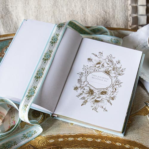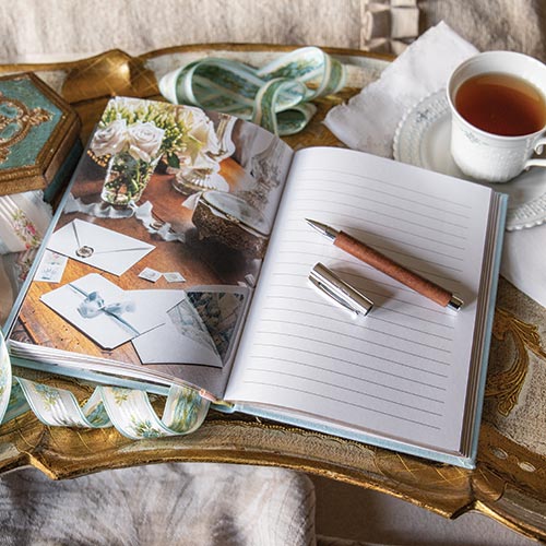 A French blue cloth covering allows the gold-debossed design to truly shine as it beckons the writer to “Live Your Bliss.” The volume opens to gilded-edged, lined sheets highlighted with inspirational quotes, interspersed with timeless full-color photographs from Victoria magazine. As the pages begin to fill, reflect on peaceful days spent in solitude or lively celebrations surrounded by loved ones. With a satin bookmark measuring one’s progress, more extraordinary occasions await, ready to be recorded at the turn of the page.