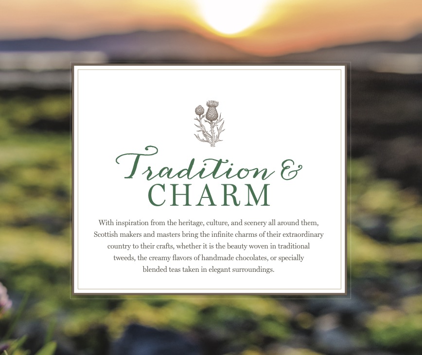 Revered Scottish poet and novelist Sir Walter Scott once penned, “Scotland is a land of mountains, glens, and islands, a land of myths and legends.” It is a place where ancient stone castles rise from the mist like mystical reveries, where shimmering lochs dot the landscape, and rugged peaks stretch toward impossibly blue skies. In these ever-enchanting environs, tartans and tweeds grace fashions and furnishings, and the uplifting lilt of a Scottish burr can charm the clouds away.