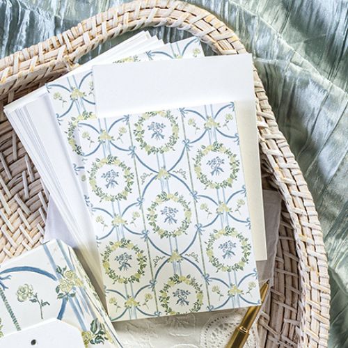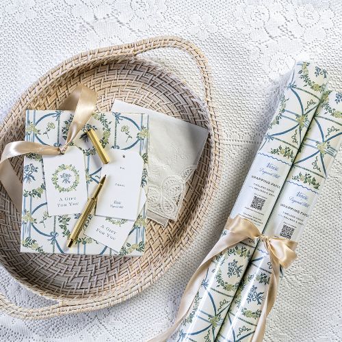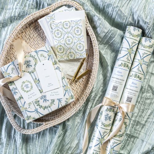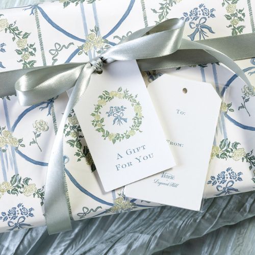 Hearts are sure to be set aflutter when presented with a treasure that is exquisitely arrayed in luxurious gift wrap from the Victoria X Dogwood Hill Timeless Charm Collection. Offering an appeal for all occasions, a classic wreath of garden roses nestles on a creamy background amidst a swirl of powdery blue ribbons. To complement the elegant gift wrap in the Timeless Charm collection, we also offer gift tags and a boxed set of gift cards with envelopes. Whether you’re presenting a hostess gift or celebrating birthdays, anniversaries, or weddings, our gift-wrapping supplies elevate even the smallest parcel.