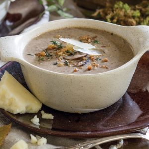 Cremini, shiitake, and porcini varieties lend tantalizing depth to Roasted Mushroom and Onion Soup, a satisfying bisque finished off with a sprinkling of toasted panko bread crumbs, sautéed mushrooms, fresh thyme, and shaved truffle cheese.