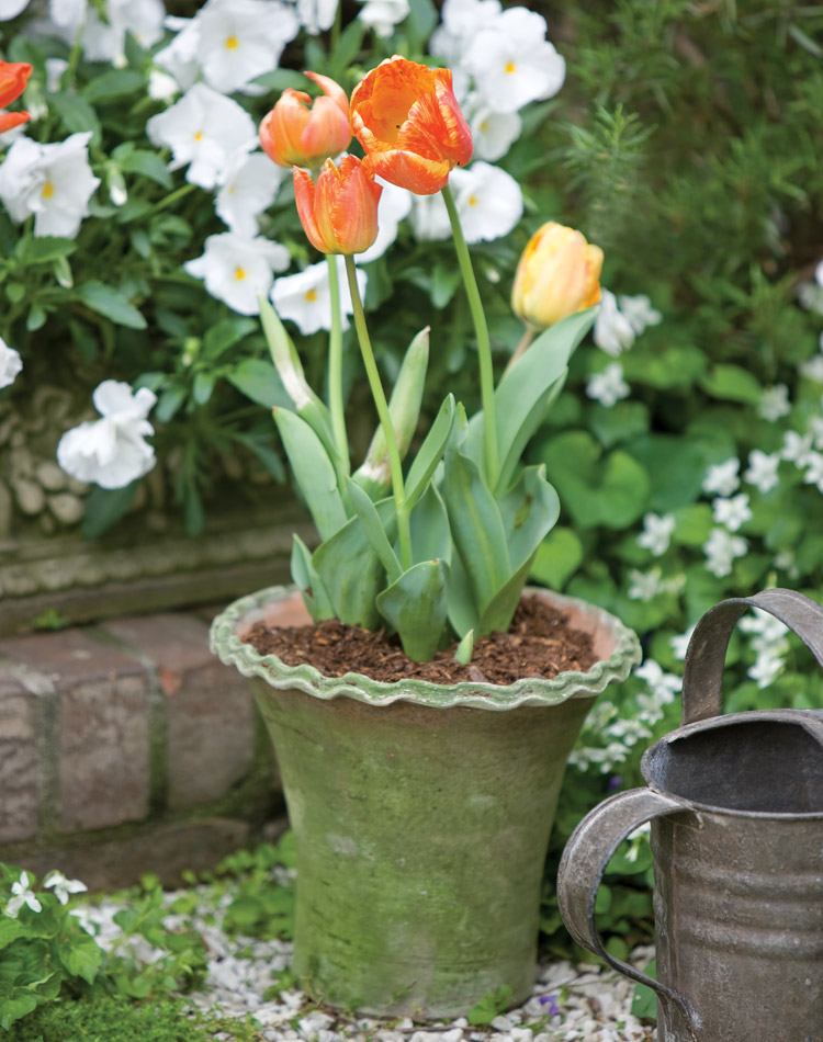 The shoots of spring bulbs lengthen rapidly as the soil warms up—their magic made evident with the garden’s first flowers. A vibrant burst of potted tulips and daffodils announces the arrival of the season with blissful color.
