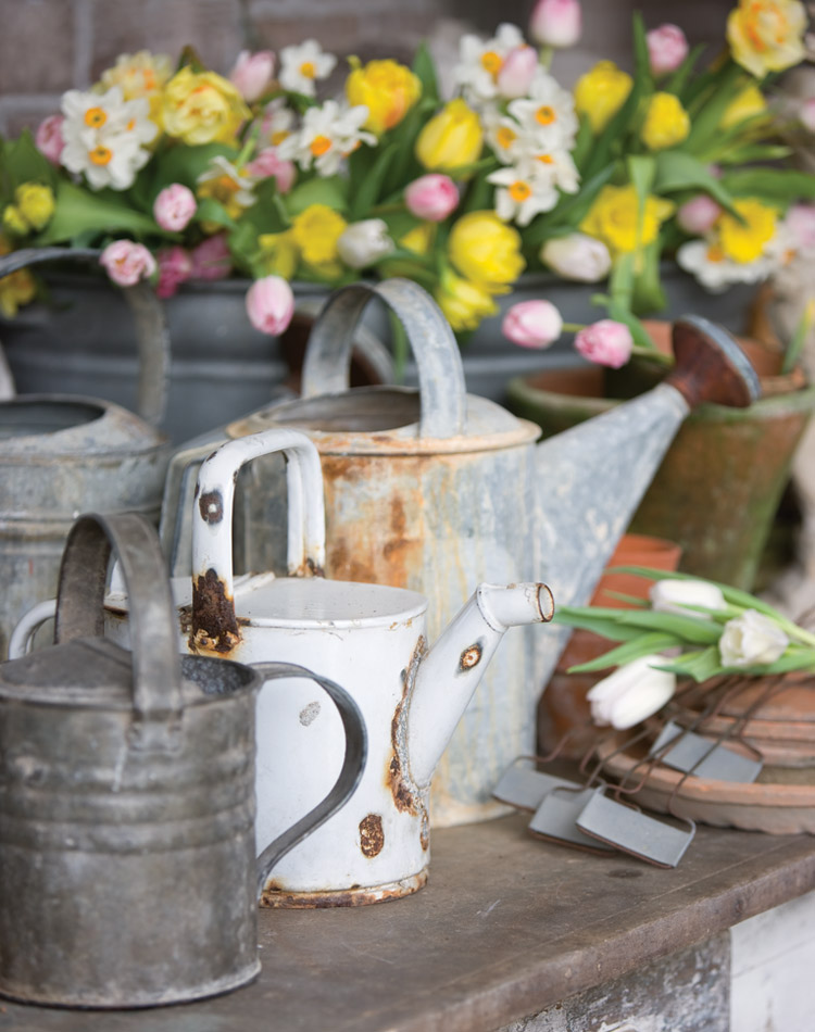After patiently abiding the cold winter season, planted bulbs reward us with their lively profusion of color. In charming juxtaposition to a collection of vintage watering cans, a joyful drift of pastel tulips and daffodils welcomes spring with a reassuring sense of renewal.