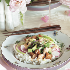 - Divide rice among serving bowls; top, as desired, with salmon mixture, green onion, cucumber, avocado, watermelon radish, red radish, microgreens, and pickled ginger. Serve with Spicy Mayonnaise.