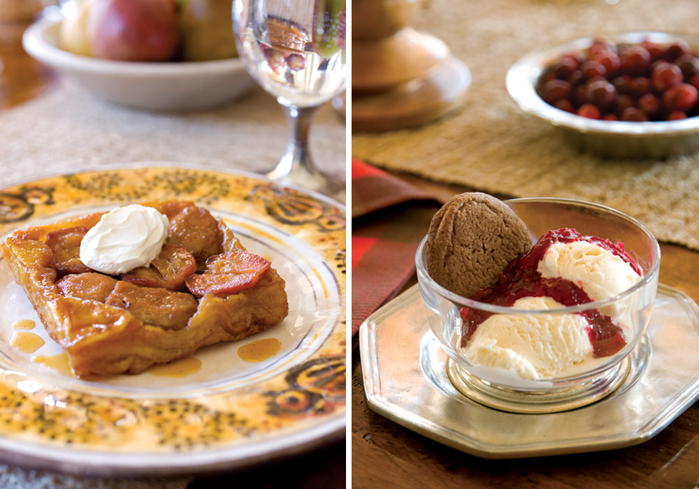 To close the feast, two desserts utilize the best available fruits. Above left: Instead of apples, our version of Tarte Tatin, uses crisp pears. A dollop of rich crème fraîche balances the sweetness of the caramelized cake. Above right: Warm cranberry compote lends tanginess and slight spice to classic vanilla ice cream, while homemade gingersnaps are ideal for dipping.
