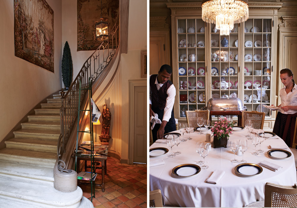 Savoring French Flavors in Avignon March 23, 2015 Aubusson tapetries line the staircase leading to the guest quarters. Waitstaff set the table in the small dining room.