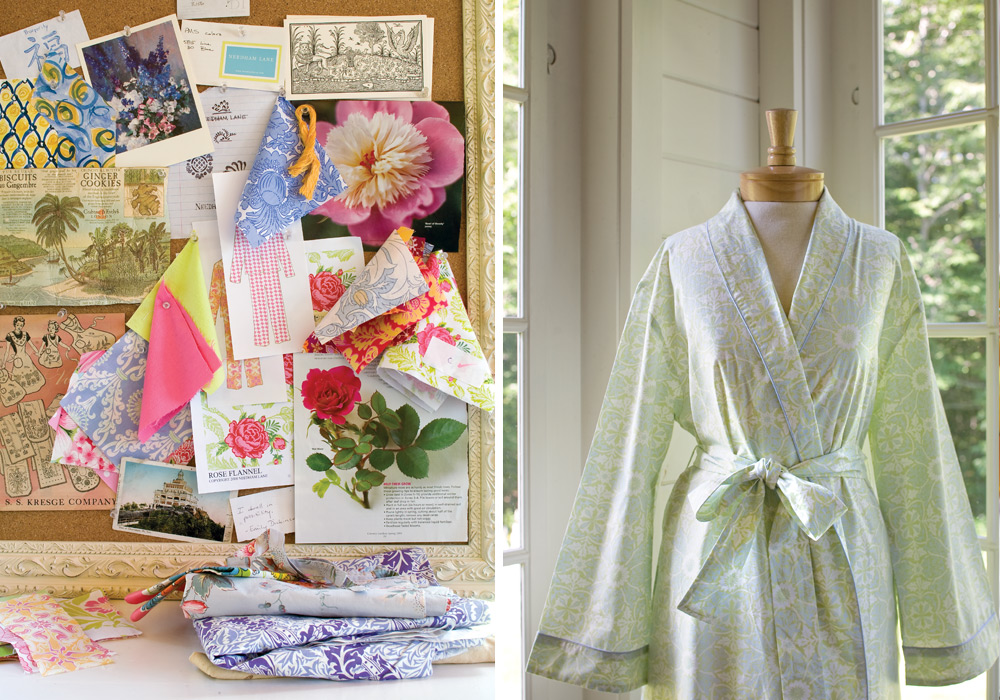 A work studio situated in the couple’s dream home overlooks hand-built stone walls and brimming gardens. Magazine clippings and tear sheets displayed on bulletin boards cloak the studio’s walls and impart an abundance of inspiration. “I am a consummate collector of tear sheets–n0t just fabric images, but home décor, gardens, and exotic places,” she explains. “I tend to collect anything that appeals to me on some artistic level.”
