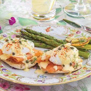 Perfect for an Easter menu, Smoked Salmon Eggs Benedict offers a twist on the usual recipe, with fillets of flavorful fish replacing the more traditional rounds of Canadian bacon. Finishing the entrée is a classic hollandaise. Roasted Asparagus echoes the hint of lemon in the buttery French sauce, making the vegetable an ideal complement to the main dish.