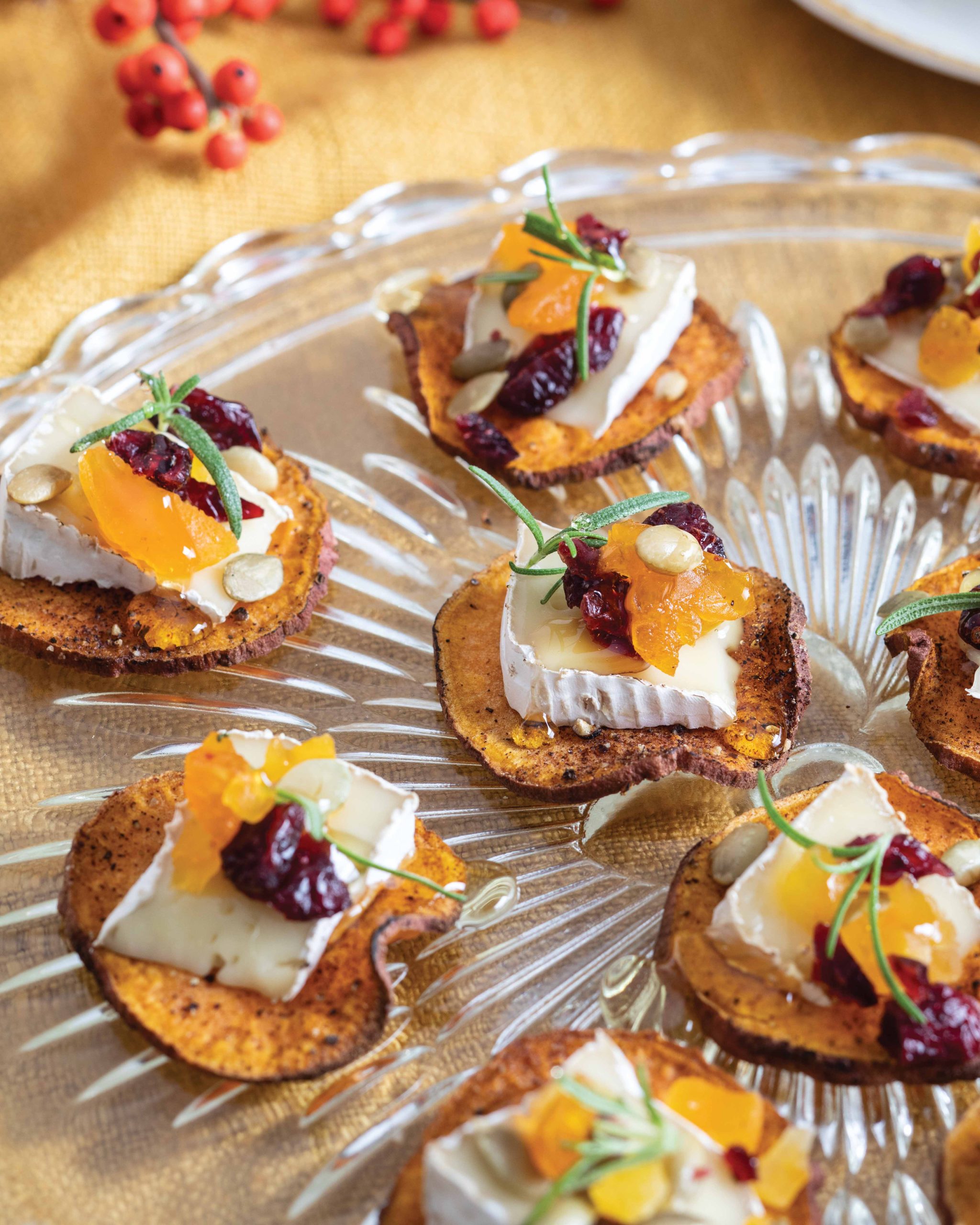 The harmonious plate of holiday savories continues with our Sweet Potato Bites, which are crowned with a medley of toppings, including Brie wedges, pumpkin seeds, dried cranberries, and sprigs of rosemary. These warm delights fill guests with gratitude, allowing each to fully embrace the autumn season.