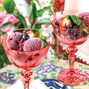 Rose water lends a subtle floral note to Summer Berry Rose Sorbet, highlighting strawberries, blueberries, and blackberries.