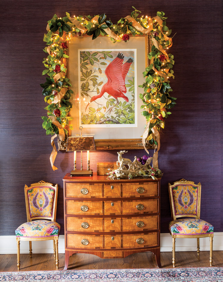 Consider layering extra cheer with greenery, such as garland added to a mantle or photo frame. Pulling out charming seasonal decorations and other special keepsakes, such as a glittering reindeer and sleigh, can be a gateway to Yuletide.
