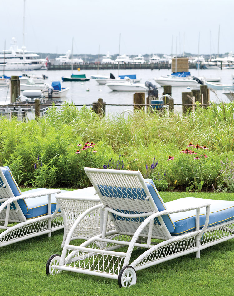 Above: Thoughtful touches at the White Elephant hotel, such as harbor-view wicker chairs for lounging and nightly turn-down service that includes a box of chocolates, let guests know that their comfort is of utmost importance. Hedges brimming with colorful flowers, perfectly manicured lawns, and hydrangea bushes with melon-size blooms surround the inn with color and life.