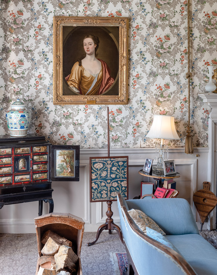 Adjoining the Dining Room, the Lower Drawing Room is where ladies would have gathered for afternoon tea or retired to socialize after dinner. Another example of French hand-blocked wallpaper graces the walls here, as well as portraits of the Duke and Duchess of Perth.