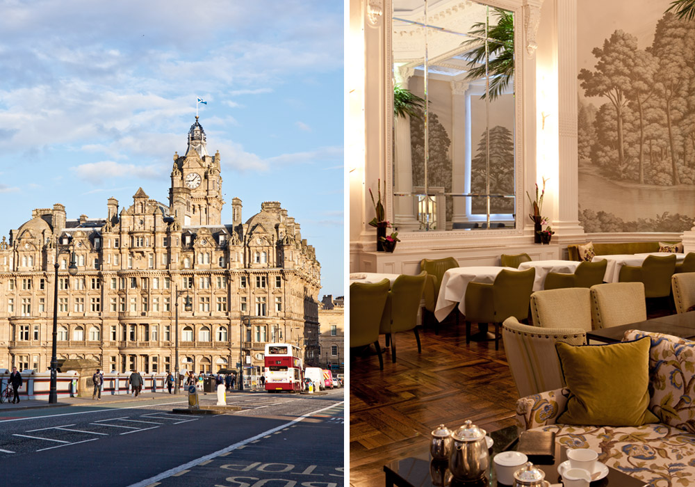Rising from Edinburgh’s city center, the impressive five-star Balmoral Hotel (left) is a striking mix of Victorian and Scottish baronial architectural styles. It opened in 1902 as the North British Hotel (or simply the “N.B.”)—a name that remained until the 1980s. Among its many amenities is a sumptuous afternoon tea, served in the Palm Court (right). The timepiece in the Balmoral’s iconic clock tower is set three minutes ahead to give rail passengers extra time to reach their trains.
