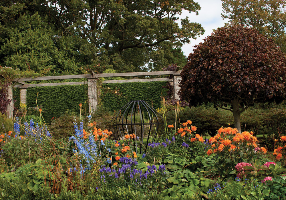 In the Sunk Garden, a pergola encloses an expansive two-level landscape awash in Lord Londonderry’s favorite colors of blue and orange.