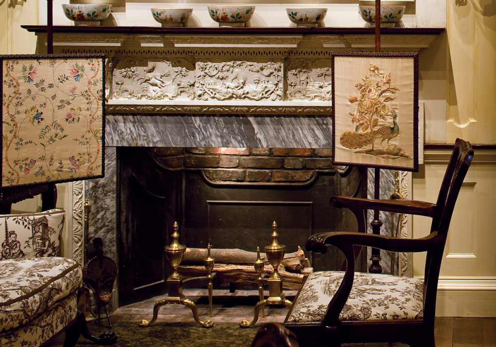 The Blackwell Parlor is noted for its remarkable architectural details. The cottage is now home to a museum store, where several decorative items, such as these pillows, are available for purchase. The Inlay Room highlights an array of inlaid wood furniture and gaming tables.