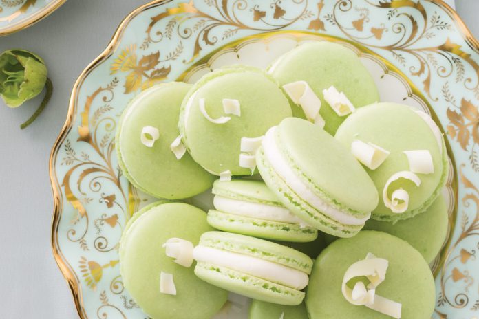 Bite into refreshing White Chocolate–Mint Macarons for a taste of peppermint sprinkled with dainty curls of sweetness.